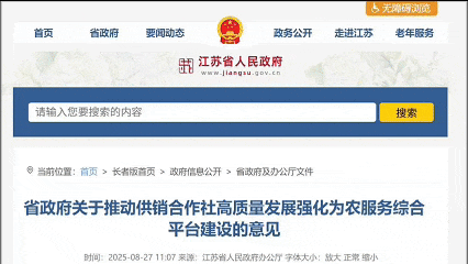 2025年8月20日,江苏省政府召开常务会议,审议《关于推动供销合作社高质量发展强化为农服务综合平台建设的意见》。会议指出,供销合作社是党领导下的为农服务的综合性合作经济组织,是推动农业农村发展的一支重要力量,要认真落实习近平总书记在中华全国供销合作总社成立70周年之际作出的重要指示精神,以服务农业农村现代化为根本目标,以促进小农户和现代农业发展有机衔接为主攻方向……