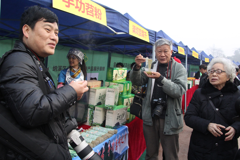 2月26日上午,“中国·四川首届茶叶开采活动周”在泸州市纳溪区拉开帷幕。由泸州市纳溪区供销社组织的全区农业特色产品展示展销区摊位前人头攒动,群众踊跃购买纳溪农业特色产品。中央、省、市、区各级新闻媒体也纷纷派出记者到现场进行采访报道,宣传纳溪农业特色产品。图为新闻媒体记者在泸州市纳溪区供销社组织的全区农业特色产品展示展销区摊位前品尝中国手功苕粉之乡——纳溪区打鼓镇生产的手功苕粉。