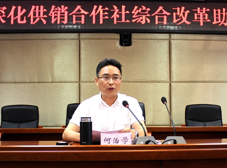 何治学在讲话中指出邻水县委、县政府对深化供销合作社综合改革高度重视,全县推进供销社综合改革特别是乡镇基层社建设成效突出,供销社各项工作独具特色。何治学要求,在今后的工作中一要持之以恒,坚定做好供销社工作的信心。供销合作社是为农服务的合作经济组织,推动农村发展进步的重要力量,是党委、政府做好“三农”工作的重要载体。深化供销合作社综合改革只能加强、不能削弱;二要坚持导向,扎实推进深化供销社改革各项工作。要拓展为农服务领域,创新服务方式,着力构建社会化服务体系。要推动基层发展,夯实为农服务基础。要提升农产品流通服务水平,发展电商,着力建设农村现代流通服务网络。要推动社有企业改革,着力构建企业法人治理体系,进一步建立健全现代企业管理制度。要推进生产、消费、供销、信用“四位一体”综合合作,着力打造为农服务平台;三要统筹协调,要强化资金、政策、职能、人才、宣传等保障,坚决保障供销社改革落地见效。