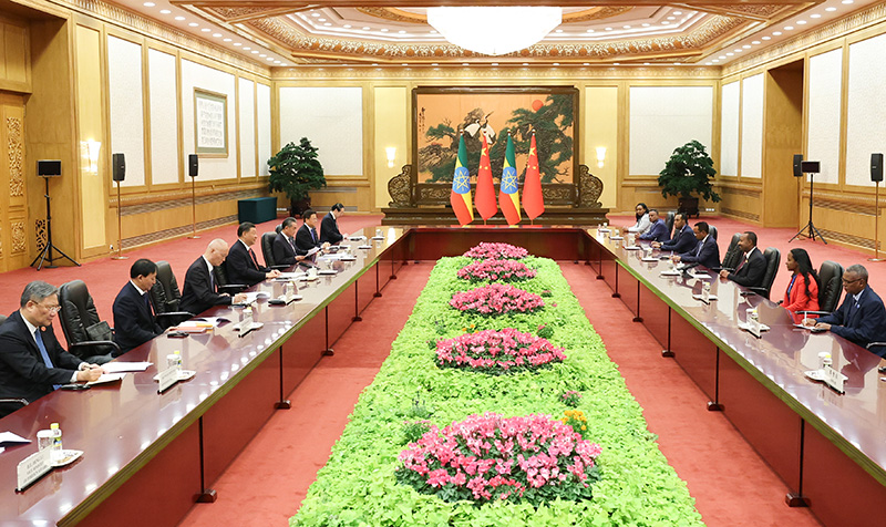 习近平祝贺埃塞俄比亚获邀加入金砖合作机制,指出埃塞俄比亚是共建“一带一路”的重要参与方,10年来中国和埃塞共建“一带一路”合作领域之广、成果之丰都走在中非合作前列。双方要以建立全天候战略伙伴关系为契机,不断巩固友好互信,深化务实合作,推动两国关系取得更多成果,做共同发展、合作共赢的朋友和促进南南团结合作、维护国际公平正义的伙伴。