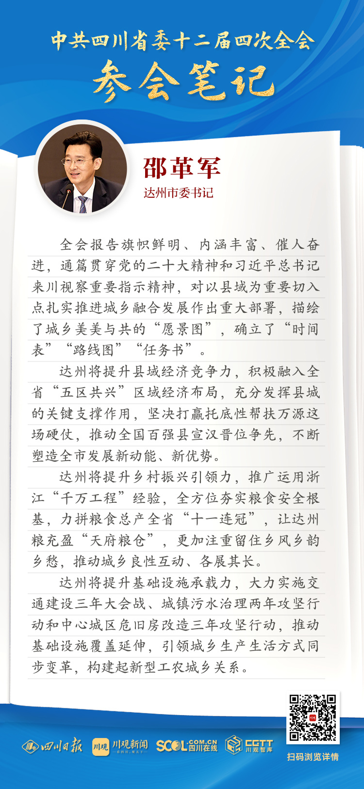 全会参会笔记 ·邵革军 ·达州市委书记 全会报告旗帜鲜明、内涵丰富、催人奋进,通篇贯穿党的二十大精神和习近平总书记来川视察重要指示精神,对以县域为重要切入点扎实推进城乡融合发展作出重大部署,描绘了城乡美美与共的“愿景图”,确立了“时间表”“路线图”“任务书”。 达州将提升县域经济竞争力,积极融入全省“五区共兴”区域经济布局,充分发挥县城的关键支撑作用,坚决打赢托底性帮扶万源这场硬仗,推动全国百强县宣汉晋位争先,不断塑造全市发展新动能、新优势。 达州将提升乡村振兴引领力,推广运用浙江“千万工程”经验,全方位夯实粮食安全根基,力拼粮食总产全省“十一连冠”,让达州粮充盈“天府粮仓”,更加注重留住乡风乡韵乡愁,推动城乡良性互动、各展其长。 达州将提升基础设施承载力,大力实施交通建设三年大会战、城镇污水治理两年攻坚行动和中心城区危旧房改造三年攻坚行动,推动基础设施覆盖延伸,引领城乡生产生活方式同步变革,构建起新型工农城乡关系。