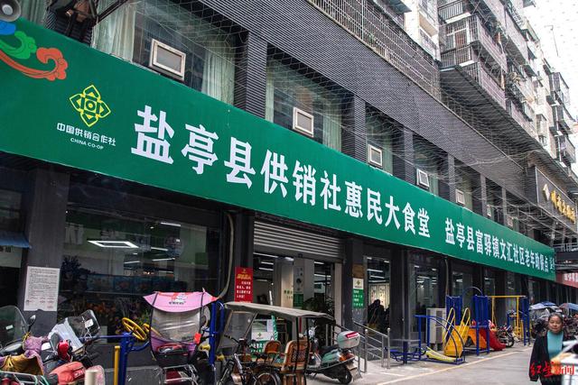 12月20日上午,红星新闻记者来到盐亭县富驿镇后街,在一处门面上方,“盐亭县供销社惠民大食堂”的牌子非常醒目。进入屋内,墙壁上贴着供销社的醒目标志,下方是“供销社惠民大食堂 大众餐饮 服务大众”的字样。整个食堂,一半是休闲区域,一半是就餐区。