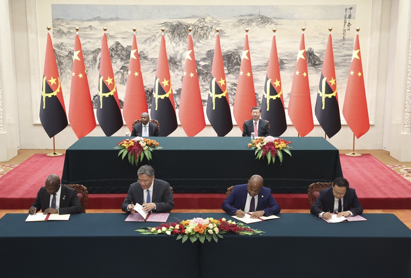 3月15日下午,国家主席习近平在北京人民大会堂同来华进行国事访问的安哥拉总统洛伦索举行会谈。这是会谈后,两国元首共同见证签署关于编制共建“一带一路”合作规划、经贸、农业、绿色发展等领域多项双边合作文件。新华社记者 丁海涛 摄