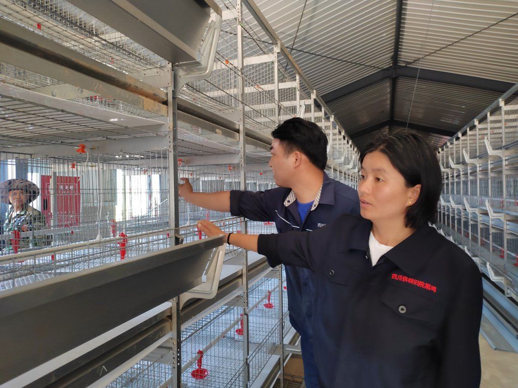 旧院黑鸡全产业链融合发展项目(一期)核心育种场,孙弟芬(左一)和助手们交谈。马发海 摄
