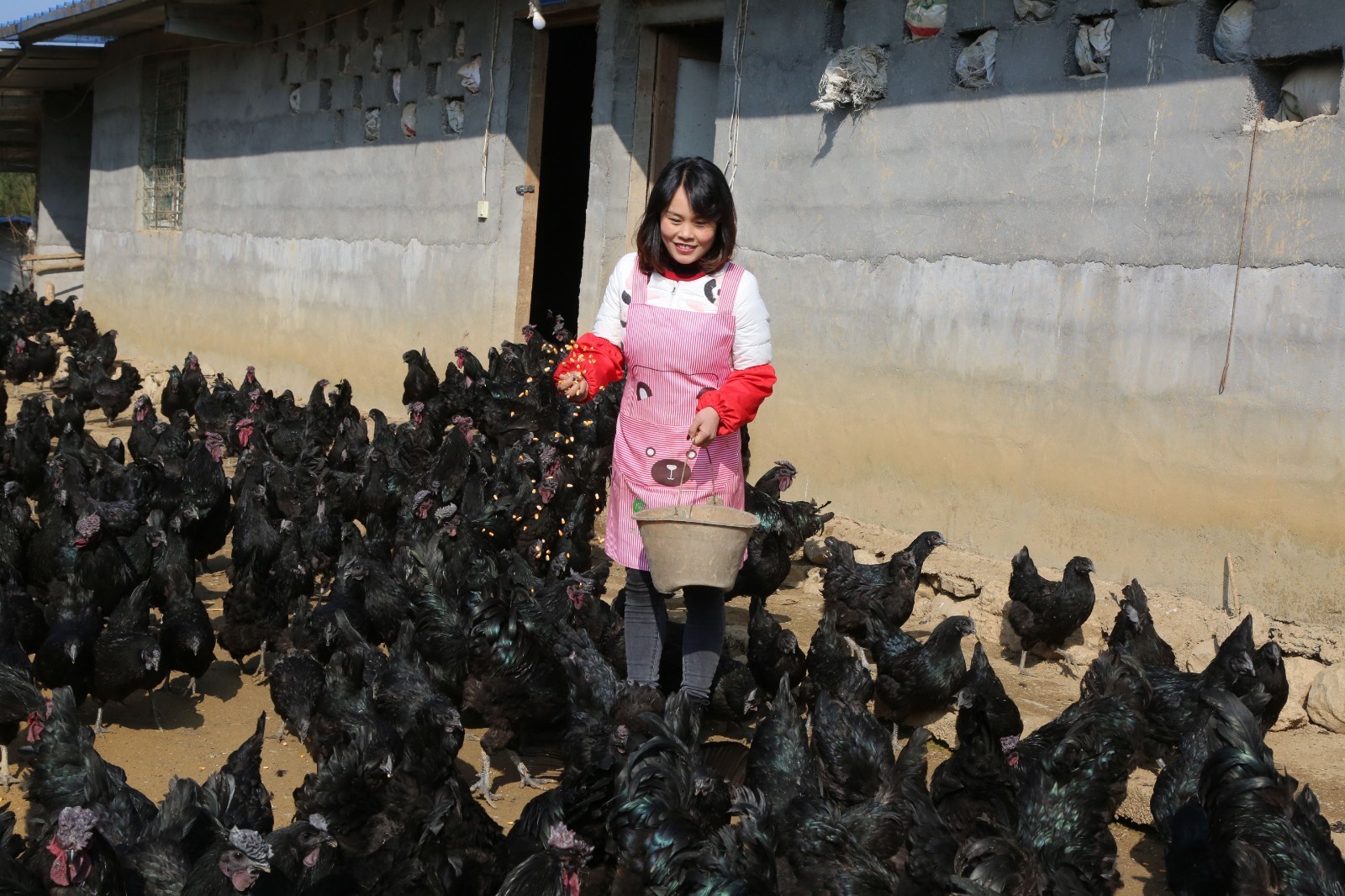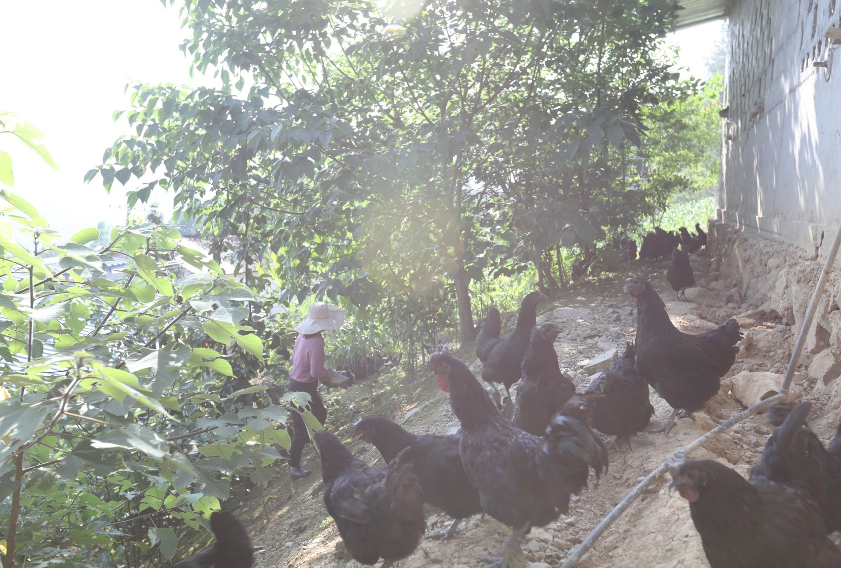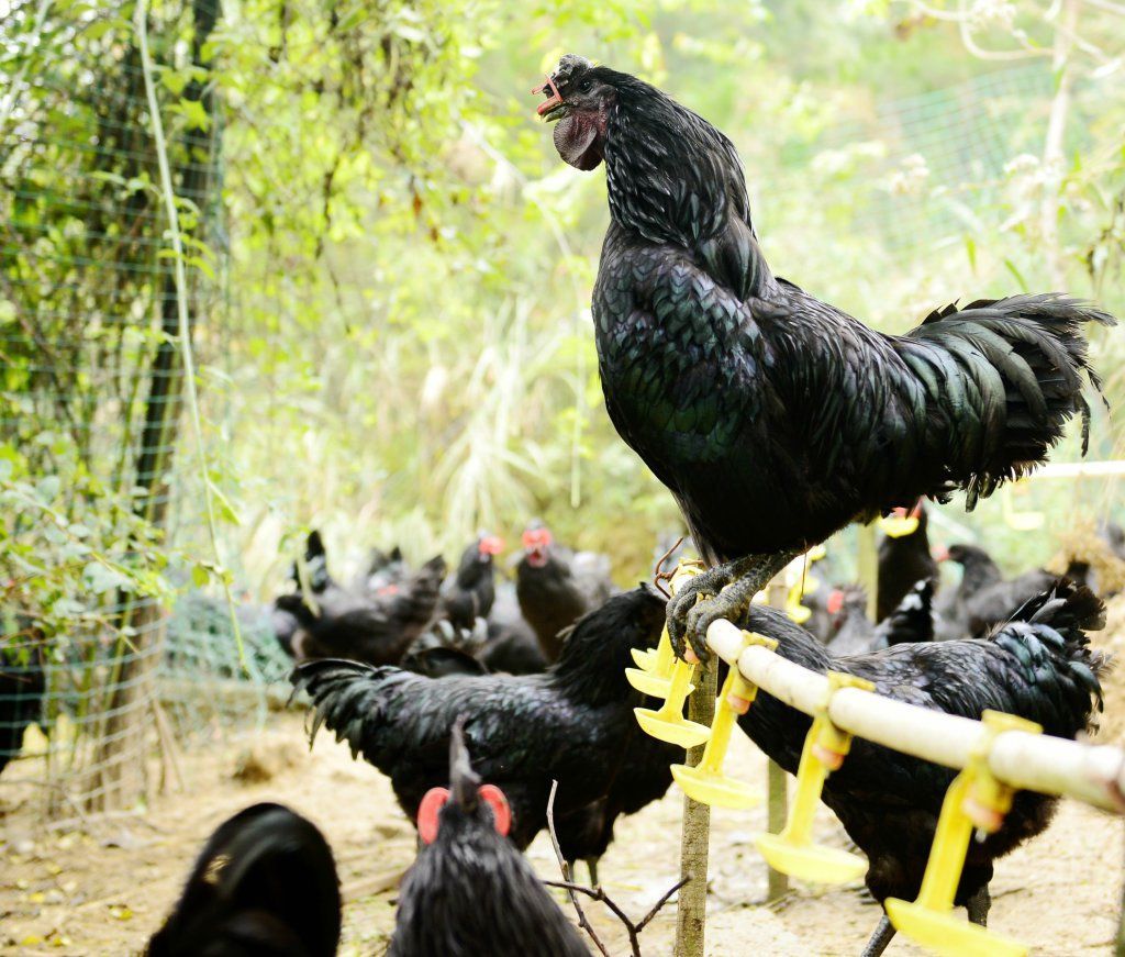 “百里坡”养殖基地内,工作人员正喂养旧院黑鸡。资料图片