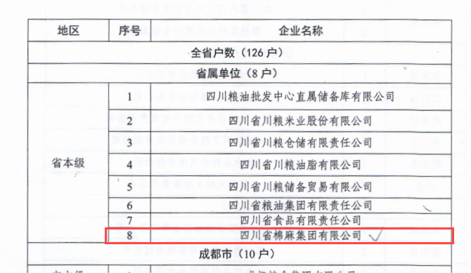 4月28日,四川省财政厅、国家税务总局四川省税务局、四川省商务厅、四川省粮食和物资储备局和四川省供销合作社联合社发布2023年承担省级有关部门委托商品储备业务的储备管理公司及其直属库名单,全省总计126家单位入选,其中省属单位仅8家,四川省棉麻集团有限公司是8家之一,且是四川省供销社下属唯一入选的省级社有企业。