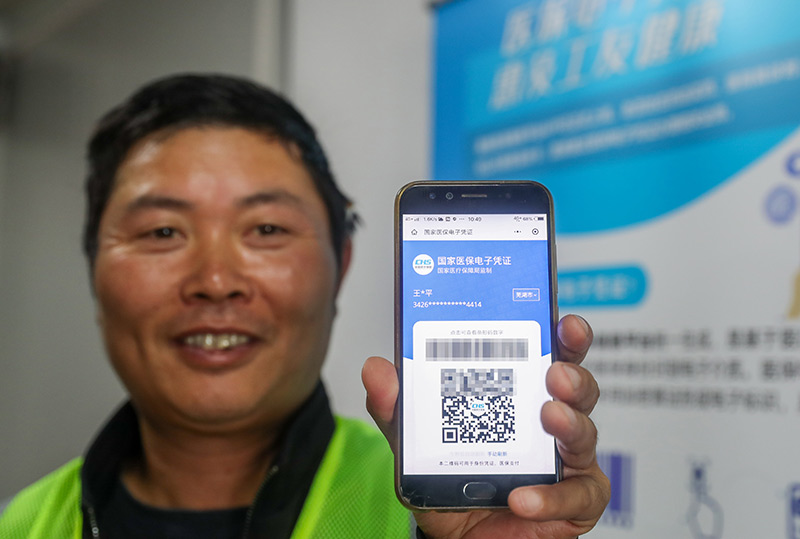 来自安徽的农民工王亚平展示已激活的医保电子凭证(2020年10月20日摄)。新华社记者 丁汀 摄
