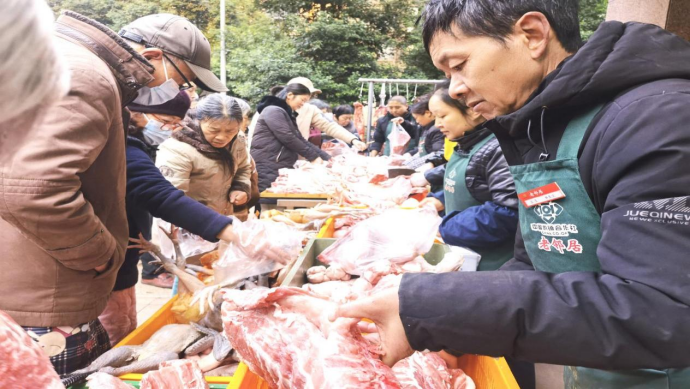 年货节现场热闹非凡,各类年货商品琳琅满目。传统年货如生鲜、零食、酒水、饮料、水果、牛奶等一应俱全,更有进口车厘子、螃蟹、藏乌梨、腊肉等特色鲜明的时令鲜果及风味独特的年货佳品惊艳亮相,极大地满足了消费者日益增长的多样化生活需求。生鲜展区在年货节期间尤其引人注目,新鲜的食材搭配特惠的价格,吸引了大量顾客驻足挑选。