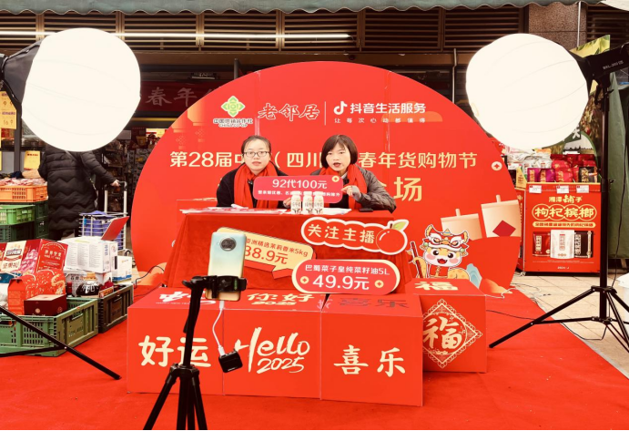 在创新多元化消费场景方面,本次年货节还在抖音平台开启了线上直播活动。成都地区老邻居门店作为主会场,攀枝花、南充、眉山、资阳、德阳等多个市州的超过500家门店同步上线,为消费者带来了一场线上线下互动的新春消费体验。直播过程中,带货主播热情洋溢地向观众推介各类特色精品年货,顾客只需在直播间轻松下单,即可随时前往就近门店便捷提货。据统计,线上直播活动观看人数近十万,线上线下客流量超千万,销售额较去年同期大幅增长,线上线下深度融合的消费模式取得了显著成效。