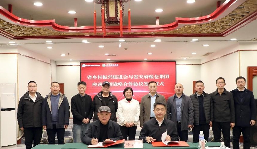 3月3日,四川省天府粮仓集团与四川省乡村振兴促进会座谈会暨战略合作协议签约仪式在成都举行。省乡村振兴促进会会长边慧敏;省供销农资集团党委书记、董事长,省天府粮仓集团董事长王华平出席仪式并讲话。省乡村振兴促进会执行秘书长周承江;省供销农资集团党委副书记、总裁,省天府粮仓集团总裁许宏勇分别代表双方在协议上签字。省乡村振兴促进会副会长牛柱、综合室主任王翌欢;省供销农资集团副总裁、省天府粮仓集团副总裁王建华、文建波及办公室、人资部、投资部、邦力达公司、天府粮仓酒业公司有关负责同志参加仪式。