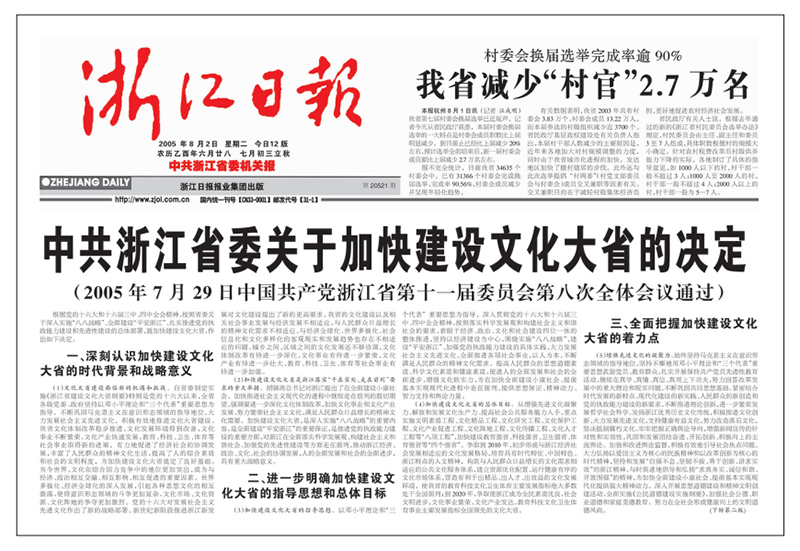 2005年7月,中共浙江省委召开十一届八次全体会议,审议并通过《中共浙江省委关于加快建设文化大省的决定》,明确提出实施文明素质工程、文化精品工程、文化研究工程、文化保护工程、文化产业促进工程、文化阵地工程、文化传播工程、文化人才工程等“八项工程”。