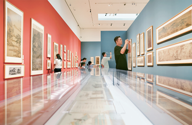 “中国历代绘画大系”,是习近平总书记亲自批准、高度重视、持续关注,并多次作出重要批示的一项规模浩大、纵贯历史、横跨中外的国家级重大文化工程。截至2025年7月,“中国历代绘画大系”共收录海内外263家文博机构的纸、绢(含帛、绫)、麻等材质的中国古代绘画藏品12405件(套)。图为2025年7月8日,游客在位于浙江省杭州市余杭区的中国历代绘画大系典藏馆参观。