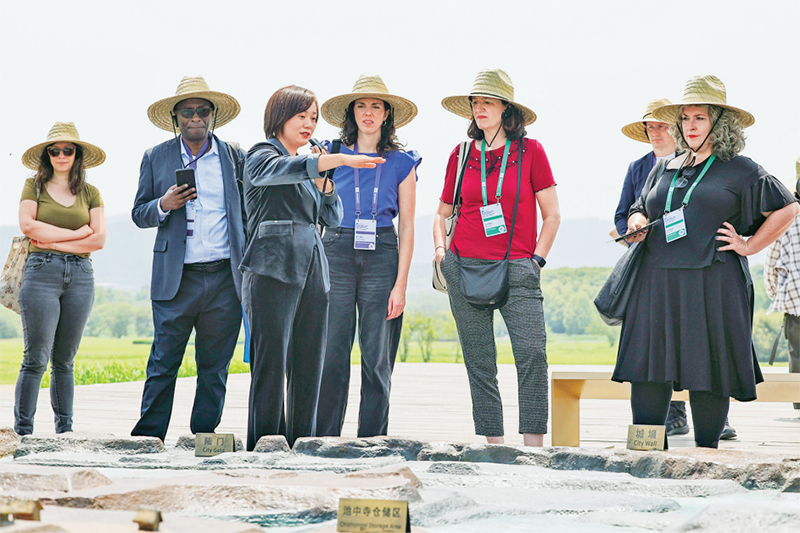 多年来,习近平总书记始终高度重视良渚古城遗址保护工作。2019年7月,良渚古城遗址被列入《世界遗产名录》。它以充足的实物依据和确凿的学术支撑向世界实证了中华5000年文明史。图为2025年4月23日,参加第三届联合国教科文组织国际博物馆高级别论坛的嘉宾在参观良渚古城遗址公园。