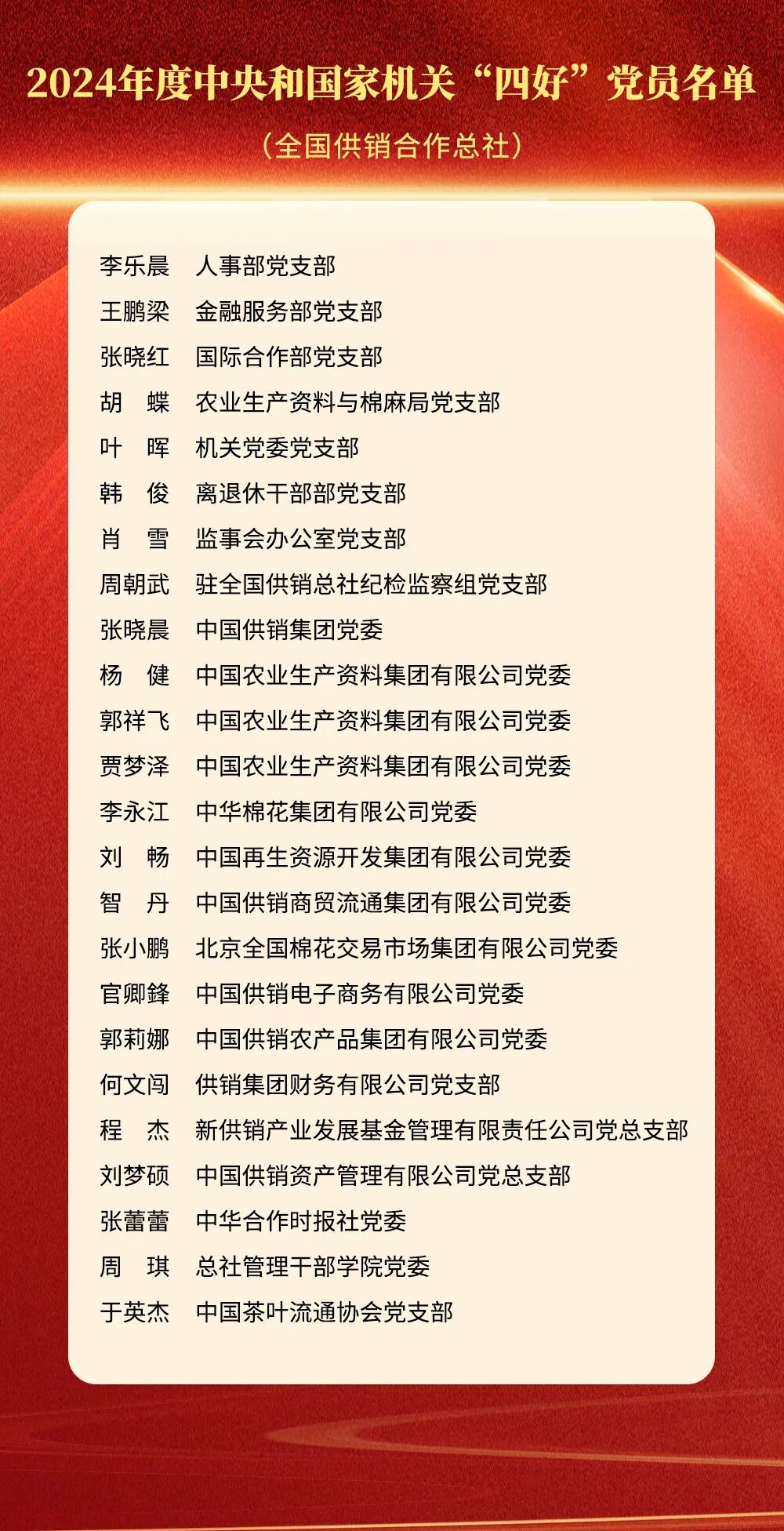 希望“四强”党支部和“四好”党员珍惜荣誉、再接再厉,在新的起点上不断取得更大成绩。总社直属机关各党支部和广大党员要以先进为榜样,坚持以习近平新时代中国特色社会主义思想为指导,深刻领悟“两个确立”的决定性意义,增强“四个意识”、坚定“四个自信”、做到“两个维护”,走好“第一方阵”、当好“三个表率”、建设模范机关,聚焦新时代党的中心任务,充分发挥党的政治优势、组织优势,持续锻造坚持和加强党的全面领导、推动各项任务落实的坚强战斗堡垒,充分调动广大党员、干部抓改革、促发展的积极性主动性创造性,在以高质量党建促进供销合作事业高质量发展中走在前、作示范,为推进乡村全面振兴、加快建设农业强国作出新的更大贡献。