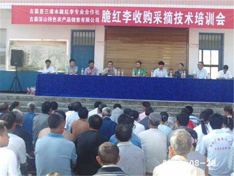 8月20日,古蔺县三道水脆红李专业合作社、古蔺深山特色农产品销售有限公司联合在古蔺镇三道水村举行了脆红李收购采摘技术培训会。参会果农200余人,县供销社主任刘义勇、县农工办产业科科长邓先才、古蔺镇经发办副主任胡伦湘、县老科协刘天才、古蔺深山特色农产品销售有限公司董事长朱信义到会指导。