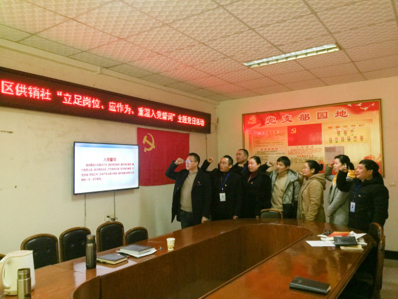 2018年1月11日,区供销社机关党支部,结合学习宣传贯彻党的十九大精神和省委十一届二次全会、市委八届四次全会精神的宣讲,组织支部全体党员,集中开展了“立足岗位、应作为、重温入党誓词”主题党日活动。