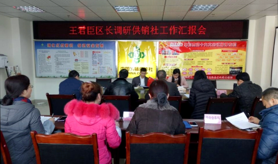王区长首先高度肯定了供销社2017年的工作成绩,在表明本次调研目的的同时,也为今后在深化供销社综合改革工作提出了工作建议和要求:以认真学习贯彻党的十九大精神为统揽,一是要紧扣区委、区政府(郫委发 〔2017〕 20号 ) 文件这 一条主线,实施好、勾勒布局2018年重点工作;二是要强化政治、经济两大功能;三是要运用靶向、开放、底线三种思维;四是加强品牌、能力、队伍、基础四大建设。结合供销社工作实际,积极融入到区委、区政府中心工作中去,抓出深化供销社综合改革的特色、亮点工作。