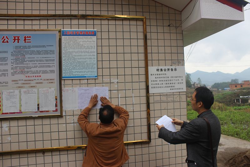 ↑上墙公布《邻水县椿木乡新庙村精准扶贫5年规划》征求村民意见