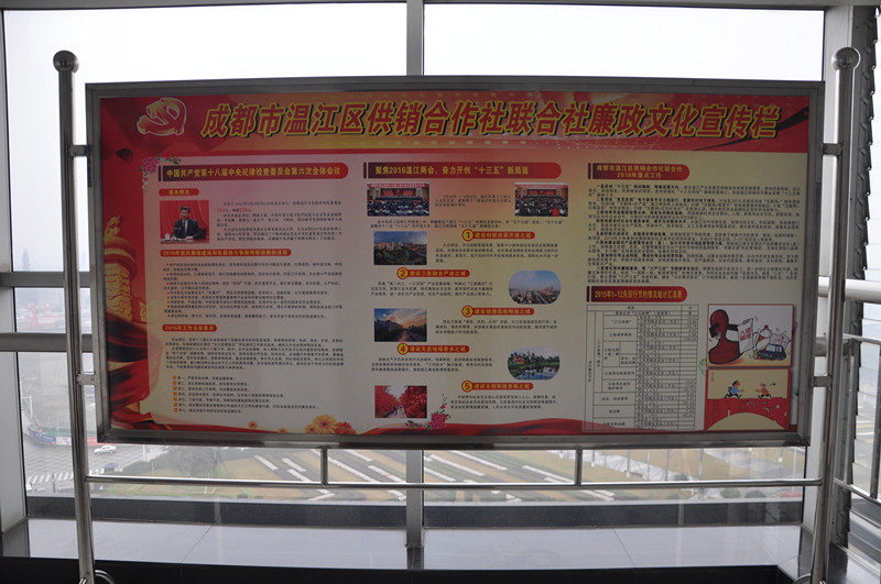 “中央十八届六次全会会精神”、“聚焦2016温江两会”、“晒‘三公’经费”、“廉政漫画......近日,成都市温江区供销联社以“廉洁为农,务实为民”为主题,精心制作了长240cm宽120cm的廉政文化宣传展板,通过图文结合的形式在联社机关展出,引来许多干部群众驻足点赞。