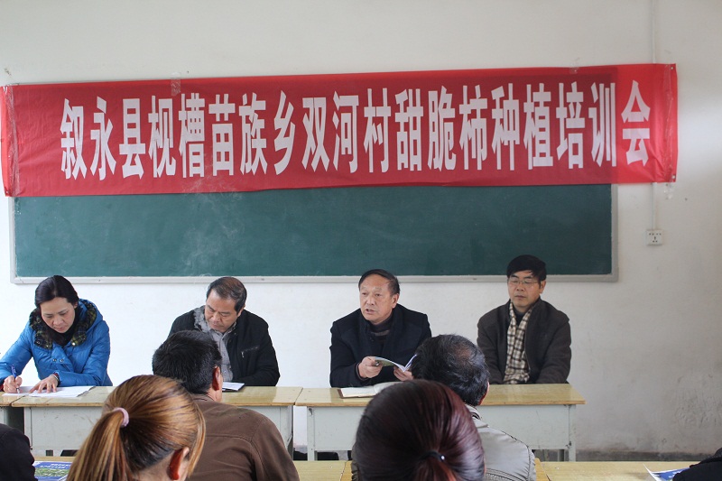 3月12日,叙永县枧槽苗族乡党员精准扶贫示范项目工程 -----甜脆柿种植管理技术培训会在双河村小学举行,村甜脆柿种植大户和党员种植户共计50人参加培训,其中贫困党员覆盖率100%。培训会由双河村第一支书主持,邀请马岭天宝山水果专合社魏达钦理事长亲自授课,县级帮扶部门供销联社领导到会指导。