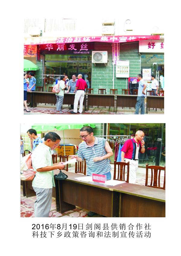 8月19日,剑阁县供销社配合县依法治县办在公兴镇开展了大型法治赶场活动,共发放法治宣传资料1000余份。现场答疑并号召大家要多渠道学习相关法律知识,保护自己的合法权益。